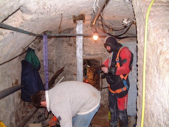 Der Brunnen stammte aus dem 18. Jahrhundert und befand sich mittlerweile im Kellergewölbe des darüber errichteten Hauses. Der Zugang gestaltete sich demnach etwas schwierig, da auch noch ca. 10 m Höhenunterschied innerhalb des Brunnens überwunden werden mussten bis zur Wasseroberfläche. Nach Errichtung eines Galgens mit Sicherheitsgeschirr konnte der Taucher auf den Grund des Brunnens und die Schlammablagerungen mit einer Saugpumpe (Förderhöhe 25 m) entfernen. Gleichzeitig wurde die Trinkwasserleitung unsererseits erneuert und um 1,5 m verlängert, welches nun eine ständige Trinkwasserversorgung gewährleistet.